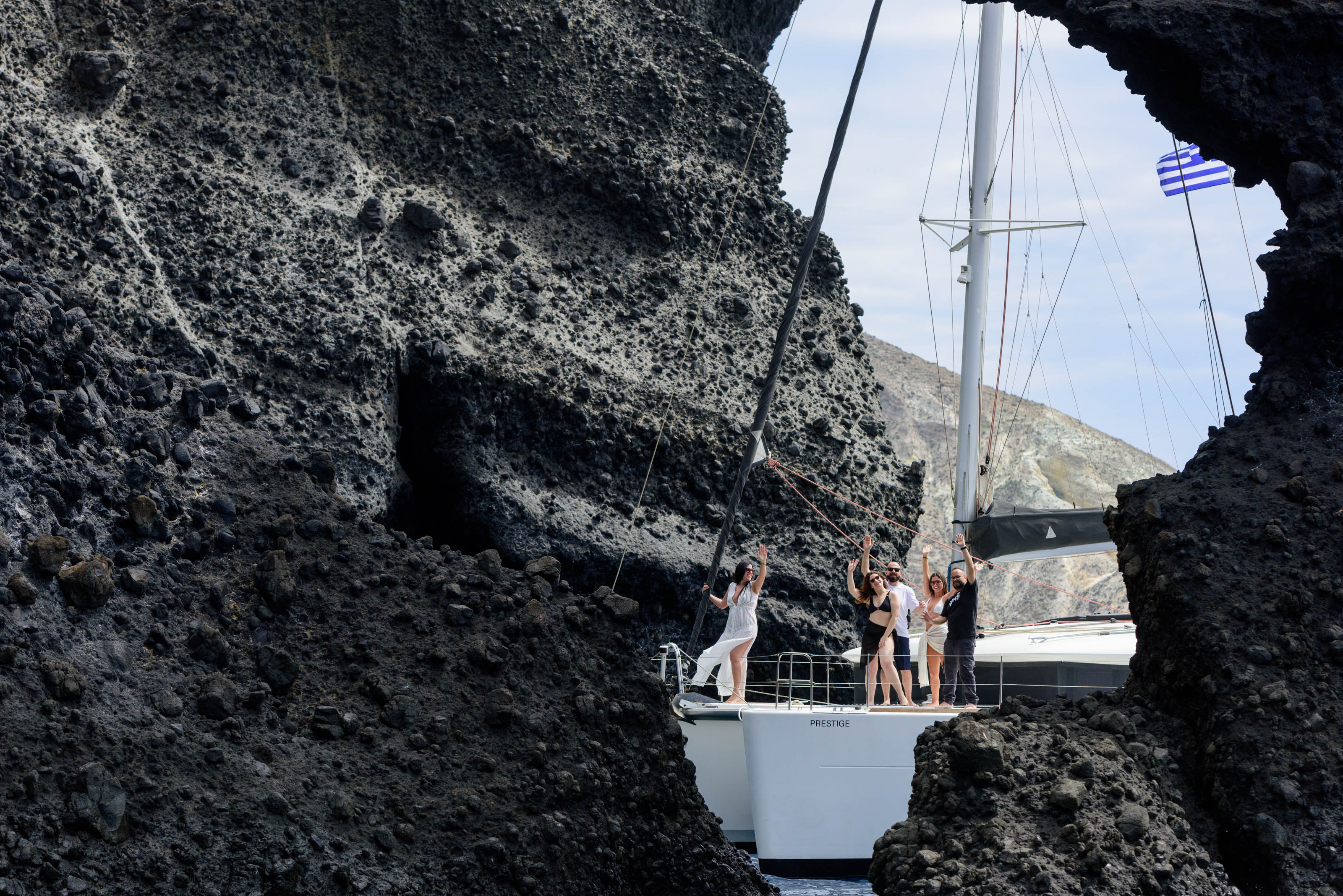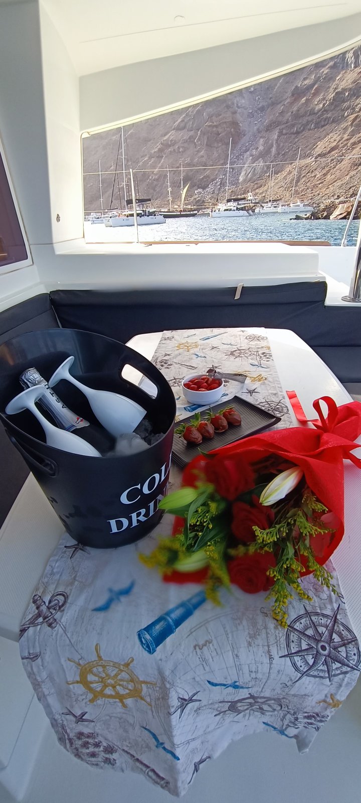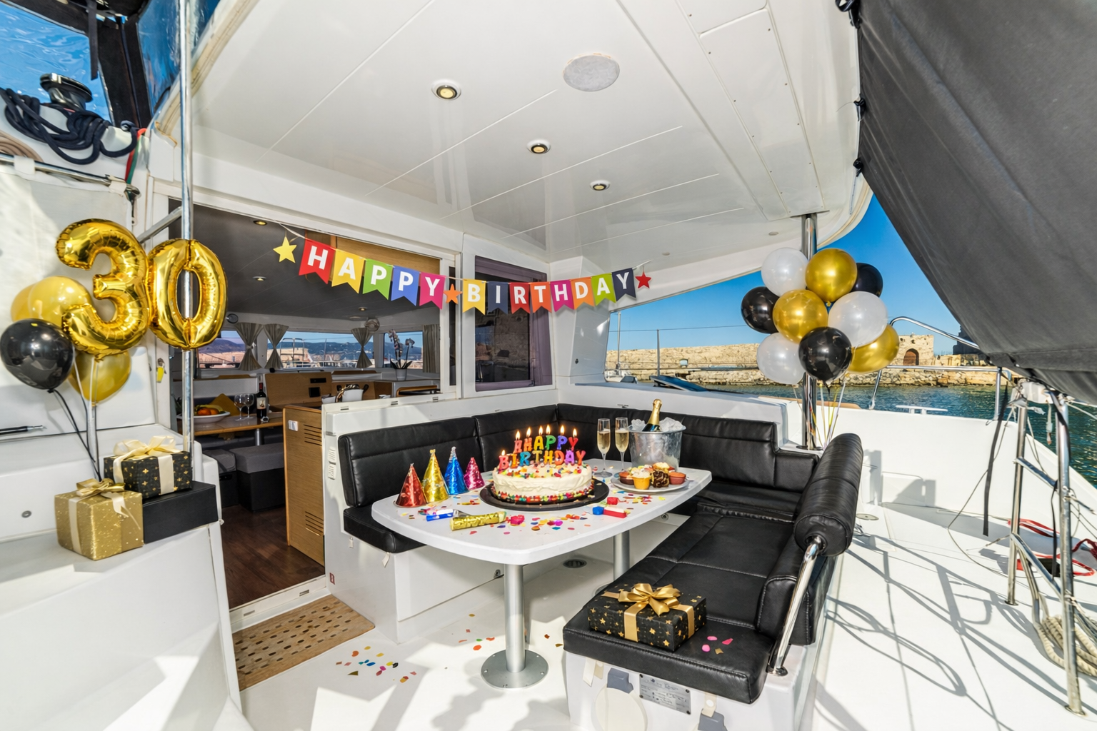 Sailing along the caldera with the dramatic cliffs and the volcano as your backdrop, the spacious decks of the catamaran allow us to create an elegant birthday setup, including: