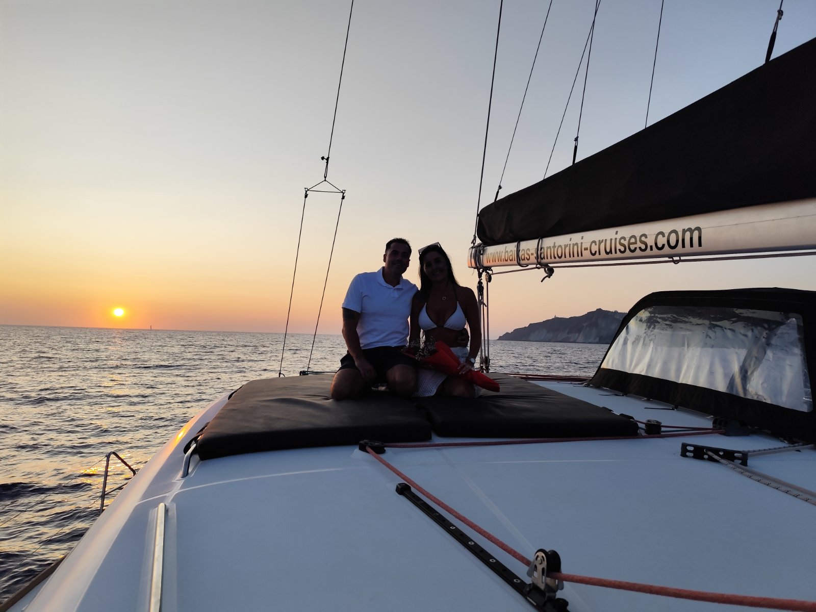 The most magical moment of the experience takes place during the return cruise, exactly at sunset, as the catamaran passes beneath the Lighthouse of Akrotiri. With the sun sinking into the Aegean and the sky painted in golden and pink colors, you will have the perfect romantic setting to ask the most important question of your life.